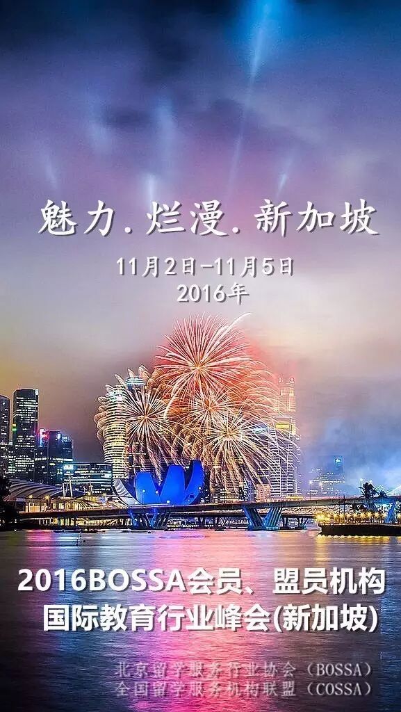 北京留学服务行业协会(BOSSA)、全国留学服务机构联盟(COSSA)将于2016年11月2日(三)-11月5日(六)在东南亚美丽的新加坡举办“2016会员盟员国际教育行业亚洲峰会(新加坡)”。既在2014年全国留学服务机构联盟(COSSA)第一届联盟大会在马来西亚举办之后,协会每年在海外举办一次国际间教育机构互访、合作的国际类峰会。而2016年,我们选择在美丽如花般的东南亚国家:新加坡。